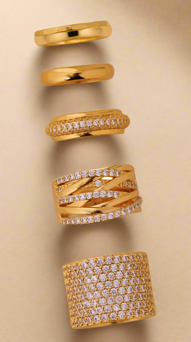The Cubic Zirconia Wide Band Ring is bold, polished, and made to shine. With rows of precision-set Cubic Zirconia, it catches the light from every angle without feeling overdone. The wide band gives it presence, while the sparkle keeps it playful.